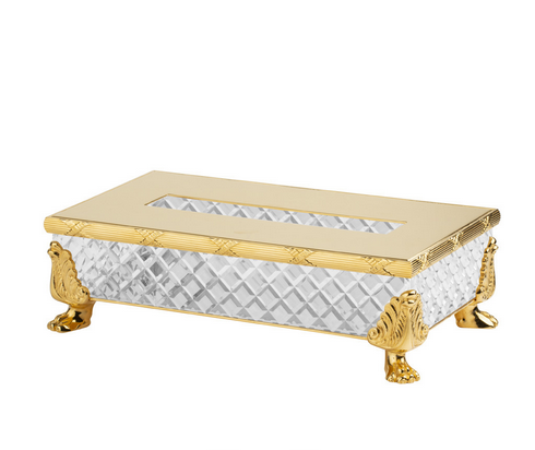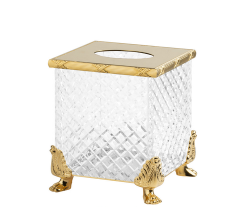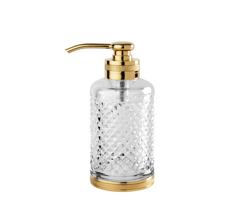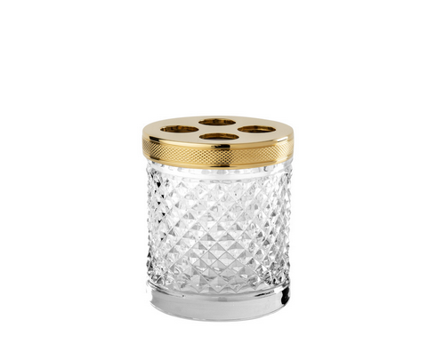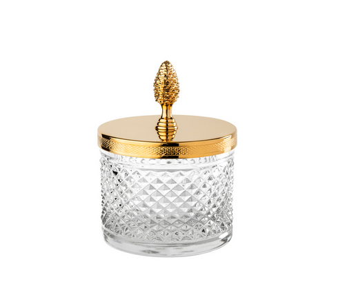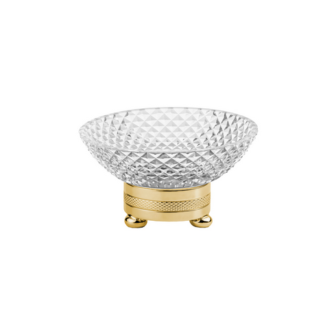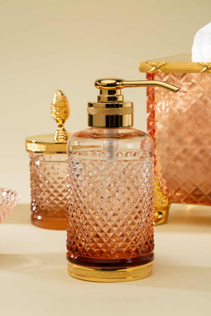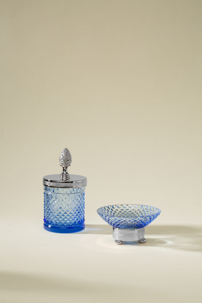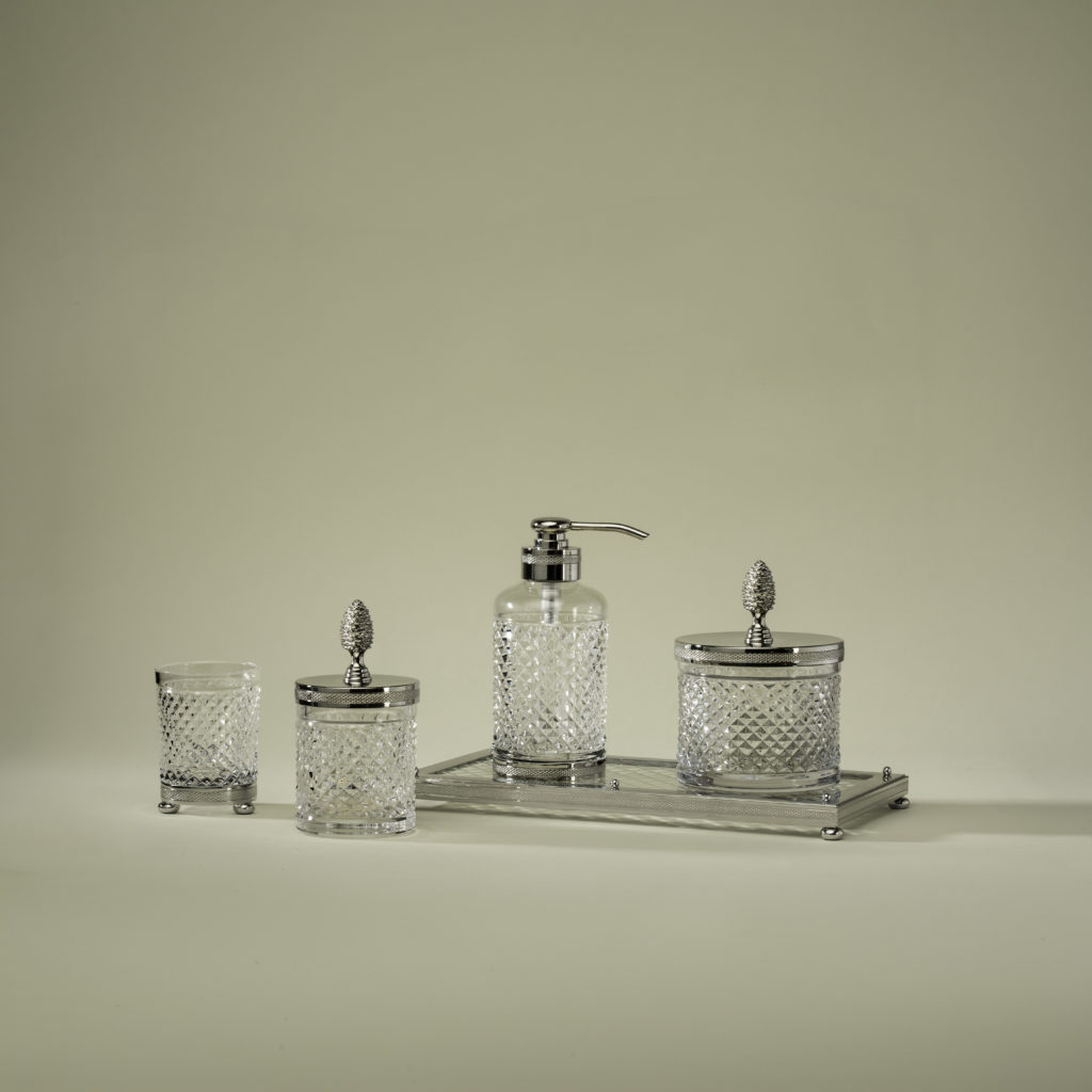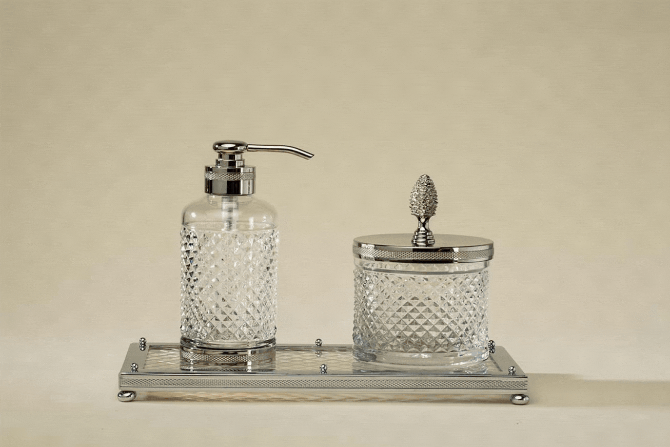 Au cœur de plusieurs collections, le cristal taillé occupe une place centrale. Distributeurs de savon liquide, coupes à savon, boîtes à mouchoirs, plateaux, pots à coton, corbeilles, verres et flacons à parfum : chaque accessoire associe un cristal taillé à la main à un laiton travaillé avec soin, pour composer des ensembles cohérents et raffinés. Par la précision géométrique de ses facettes, le cristal capte la lumière ambiante et la renvoie en éclats vifs et nets. La qualité du cristal de Cristal&Bronze fait ici la différence : sa pureté et sa densité révèlent toute la limpidité de la matière et dialoguent avec la brillance du laiton ciselé.